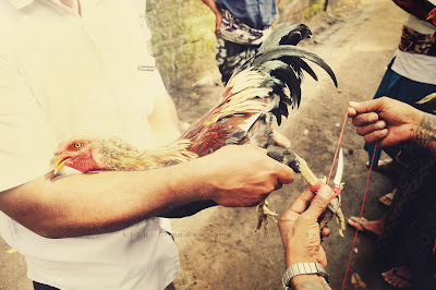 Cockfighting in Bali is known as "Tajen". Derived from the word meaning sharp spurs and has become a hallmark of Balinese life. In the beginning "Tajen" is part of religious rituals "Tabuh Rah" or "Prang Sata" in the Balinese Hinduism. Which "Tabuh Rah" This requires presence of dripping blood as a symbol or a requirement cleanse mankind from greed, or greed of materialistic values and worldly. "Tabuh Rah" is also significant as ritual Bhuta Yadnya which blood drips to the earth symbolized mankind requests to Sang Hyang Widhi Wasa to avoid disaster
